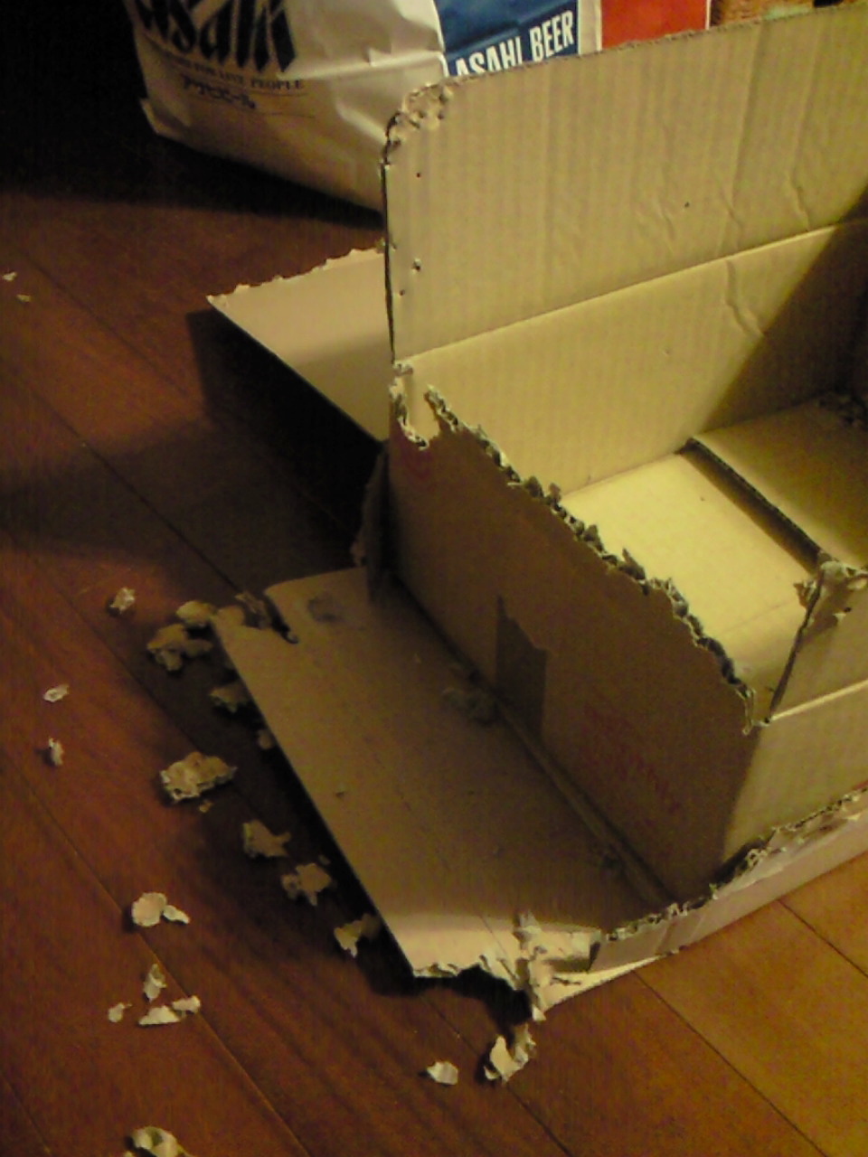 写真は解体途中の箱と、休息中の犯人1、犯人2。